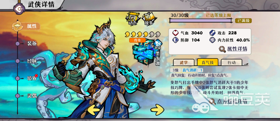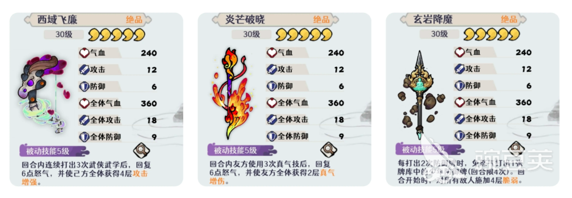 第二部分就是关于他的悬浮技能,这个角色拥有悬浮的最强保人方式,可以直接复活队友,也相当于整个团队的奶妈,每复活两次己方队友。可实现群体回满血量,没有技巧卡时,玩家可以拿角色。自身的技巧卡”幻方八渊决“,在启动该技能卡时,发现友方武侠的无形武学各1张。并使其怒气消耗-1,手牌中每有1张中立牌,怒气消耗-1,最多可叠加3层。回合开始此牌回到手牌。