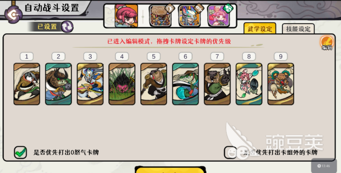 武学卡分别是十面埋伏、灵猴棍法、破天刀法、弹指一刹、烈风斩、独行刀法各两张,其中囊括了8张图系卡和4张风系卡。再来说一下自动战斗设置下的武学设定顺序,破天刀法、烈风斩、剑魔武学、十面埋伏、灵猴棍法、独行刀法、弹指一刹、兔子武学、狮子武学,按照这一自动战斗的武学释放顺序,能够不断压制敌方血量值。