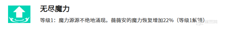 无尽魔力是薇薇安的被动技能,基础就提供22%魔力恢复,61级涨到26%,161级更是达到30%。有了这个被动,薇薇安释放技能的频率会高出不少,基本不用太担心魔力不够用的问题。配合其他恢复装备的话,几乎可以做到无限放技能。