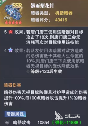 暴雨梨花针则侧重高频压制与资源优化。该暗器对目标发起18次有效攻击后,下一次释放无需消耗任何资源。当角色达成“彩星”品质阶段,更可完全规避敌方“受伤降低”类减益效果,保障输出稳定性。配合120级满阶培养,能显著强化单体爆发与持续压制能力,是中后期PVE与高难度副本中的关键输出组件。