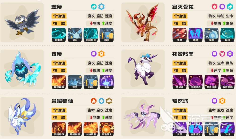 该阵容由六只精灵组成:斑枭、骨龙、夜枭、羚羊、狐仙与梦悠悠。其中幽灵属性占比达100%,形成稳定的属性协同基础。值得注意的是,四只精灵(羚羊、夜枭、狐仙、梦悠悠)均具备高速度面板设计,确保在多数对局中抢占先手权,为后续连锁控能操作提供节奏保障。