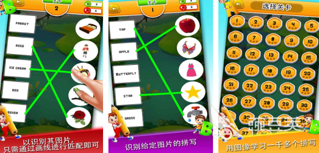将基础英语词汇学习与经典连连看机制融合,通过图像—单词双向匹配强化记忆路径。儿童只需用手指连接相同含义的图片与英文卡片,系统自动判定配对有效性;关卡结构呈线性递进:前5关仅含4组基础词(如cat、dog、sun、car),后续每5关新增2个词汇并适度提升布局复杂度,帮助孩子在零压力环境中建立语言敏感度。