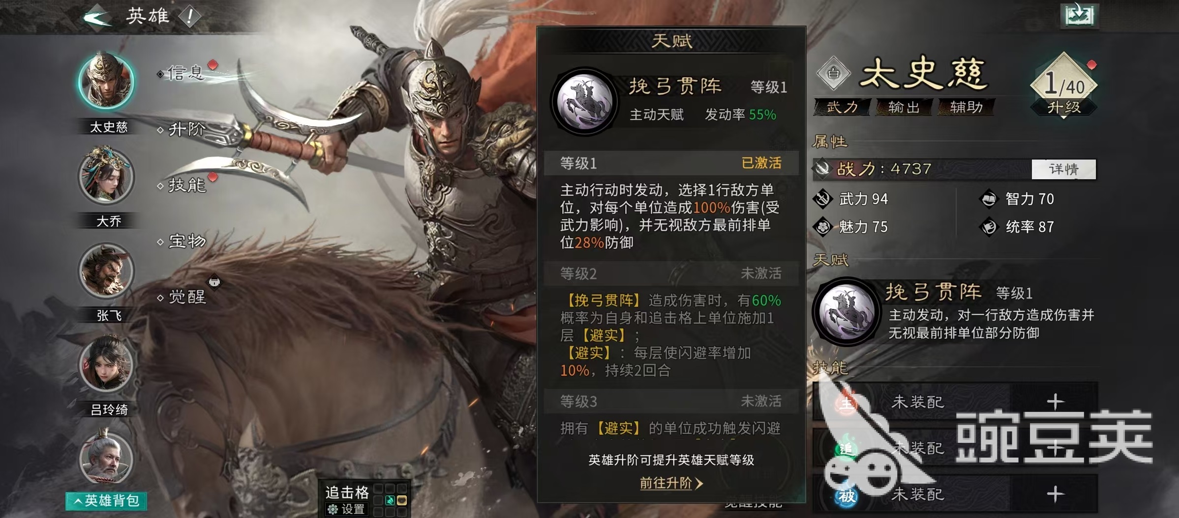 太史慈定位为高机动型物理输出兼功能性辅助。其核心天赋【挽弓贯阵】具备双重战略价值:主动行动时可选定敌方一整行单位发动攻击,造成无视前排单位部分防御的真实倾向伤害;同时,每次命中均有概率为自身及追击格内友军施加【避实】效果——每层提升10%闪避率。更关键的是,当携带【避实】的单位成功闪避敌方攻击时,太史慈将获得【击虚】层数,该效果不仅可抵消目标闪避判定,还能直接提升自身伤害输出。由此形成“增益队友→触发反馈→强化自身”的正向循环链,显著提升队伍生存与持续压制能力。