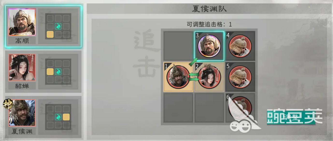 站位部署需严格遵循技能生效逻辑:将夏侯渊置于高顺与貂蝉的追击格覆盖范围内,确保其每次行动后可稳定触发队友追击;貂蝉则需布阵于夏侯渊追击格内,以保障其技能效果(如闭月之貌追加追击)顺利生效;高顺无需强制处于追击格,但当培养至炼彩品质后,可将其追击技能替换为主动技,进一步优化技能释放优先级与资源分配效率。