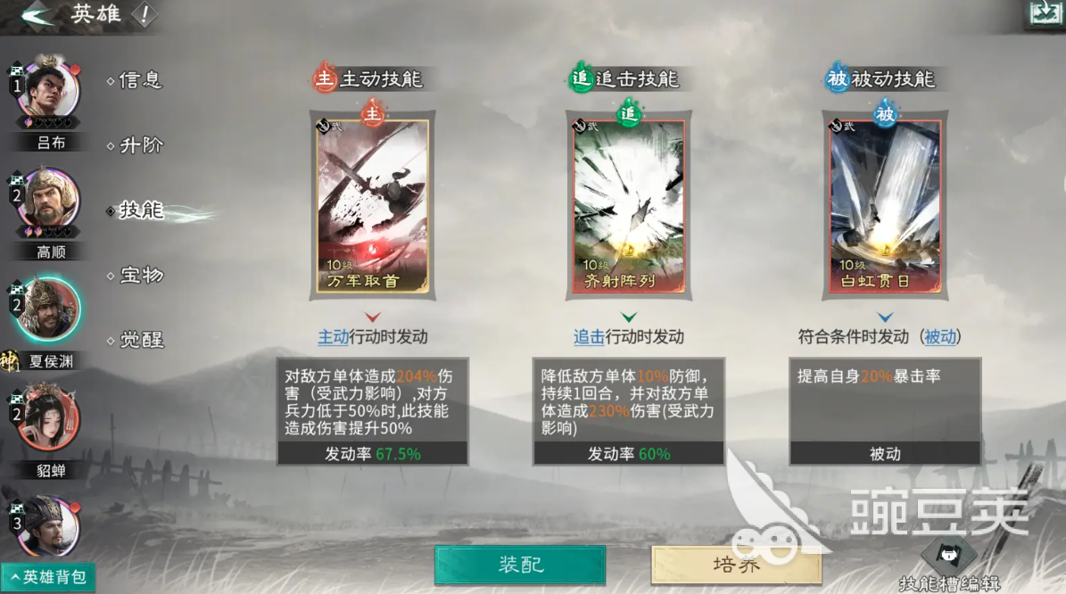 阵容搭配上,推荐采用“一主两辅”结构:夏侯渊担任主C,专注暴击率与破防属性堆叠;貂蝉承担多功能辅助职能,通过闭月之貌天赋提供45%固定增伤,并有概率赋予夏侯渊额外两次追击机会,同步覆盖混乱控制与团队治疗;高顺作为副辅助,强化全队追击频率的同时,凭借主动技增伤与被动减伤效果,大幅提升夏侯渊前期生存容错率与中期持续输出稳定性。