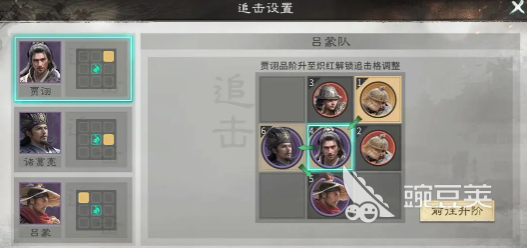 阵型部署需严格遵循追击格联动规则:吕蒙不占据追击格,诸葛亮置于其追击格内,确保每次追击动作均可高效触发。兵种配置方面,贾诩上方部署连弩军以强化远程爆发;前排左右两侧分别布设藤甲兵,凭借高物理减伤属性吸收大量伤害,稳固后排输出环境。技能搭配上,诸葛亮主带“通权答辩”(群体伤害+控制)、“运筹决胜”(增益+控场强化)与“兵不厌诈”(额外伤害+控制覆盖率提升),三者协同最大化控场持续性与伤害转化效率。