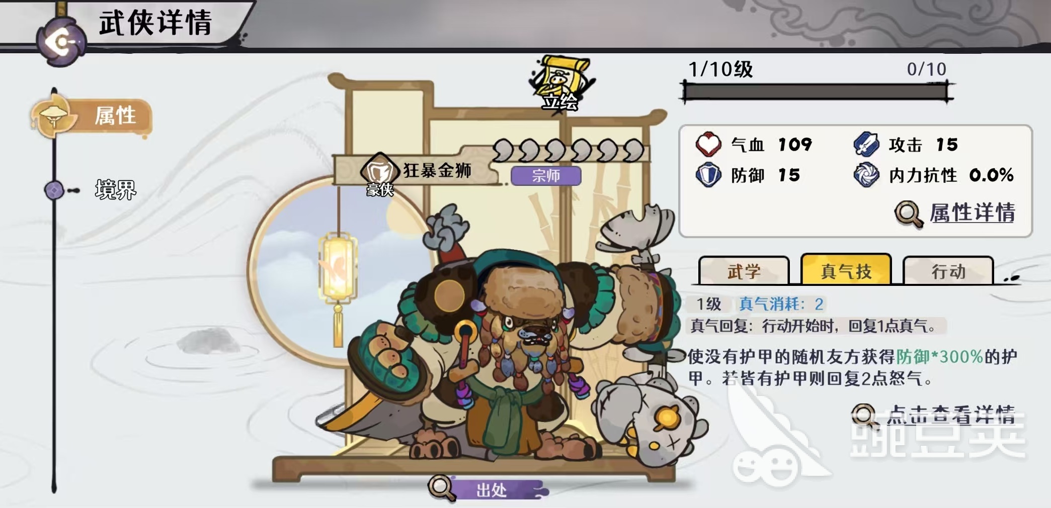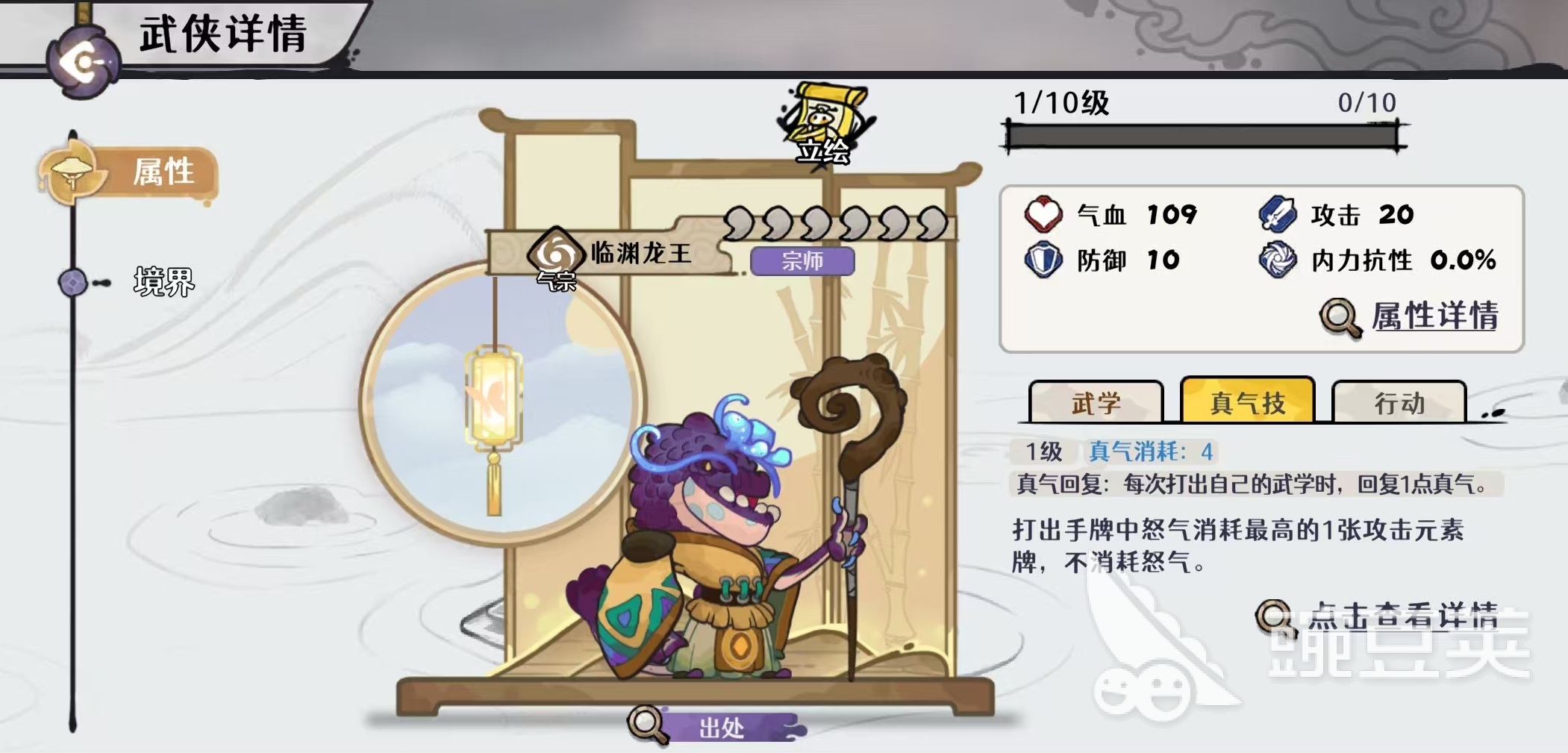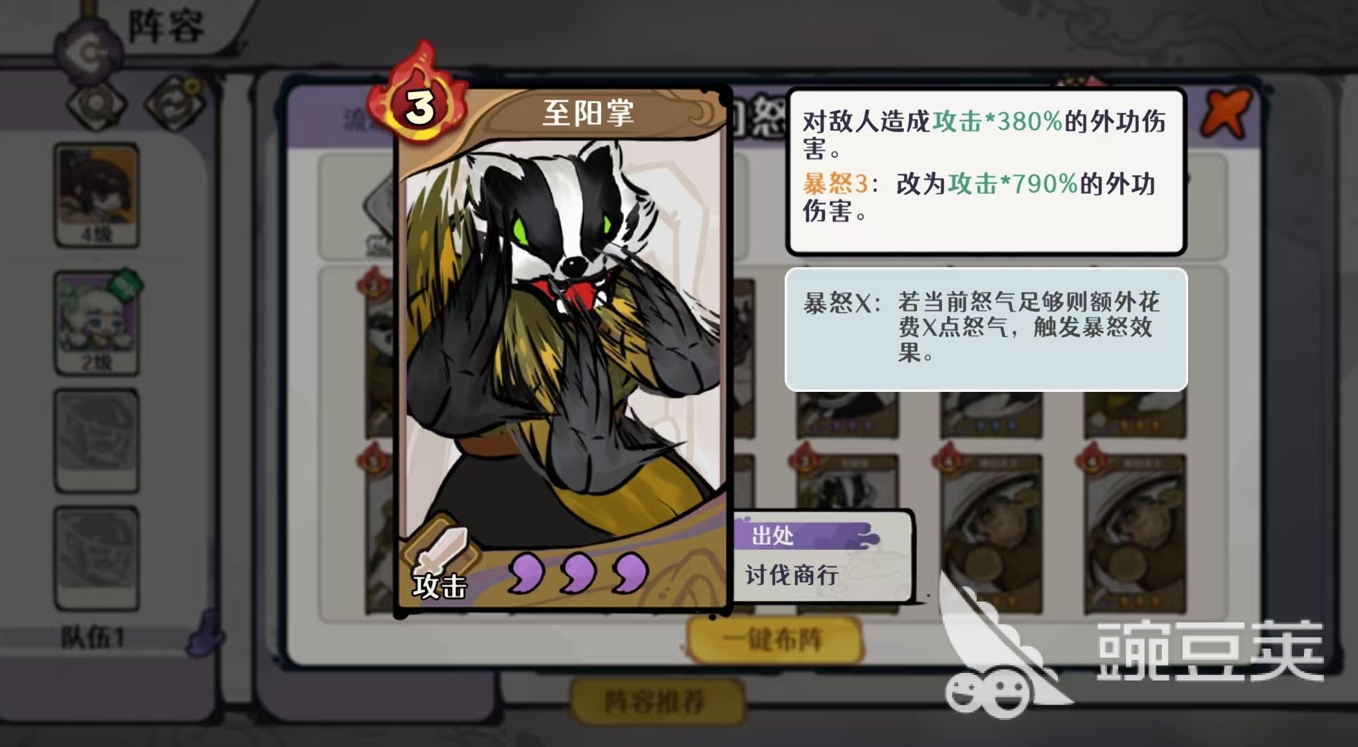 该流派的关键在于构建稳定的怒气回转闭环:前期快速抽空牌库、填满手牌,继而打出核心卡牌——临渊龙王的「玉龙杖法」。此卡基础造成90%攻击的外功伤害,且每张其他手牌中存在1点怒气消耗,即可额外附加50%攻击的外功伤害。因此,怒气储备越充足、手牌数量越多,单次爆发越可观。为支撑这一机制,豪侠位推荐选用狂暴金师。其武学「竭力之护」可为目标施加30%防御护甲,并附带力竭效果;该效果在耗尽全部怒气后触发,每1点怒气额外提供60%防御护甲。其真气技能则随机为一名友方单位赋予300%防御护甲;若目标已拥有护甲,则改为恢复2点怒气,进一步强化怒气续航能力。