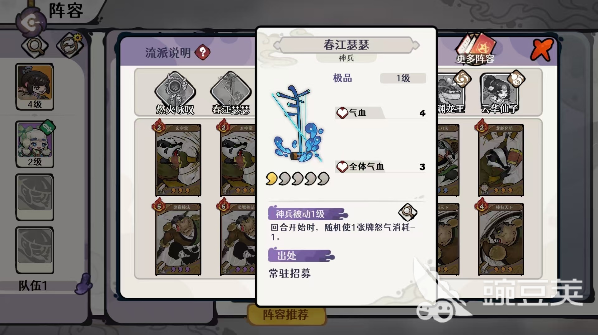 气宗位必须配置临渊龙王,作为整套体系的输出中枢。除上述「玉龙杖法」外,其真气技能可免费打出当前手牌中怒气消耗最高的攻击类元素牌,不消耗怒气,极大提升关键回合的爆发连贯性。悬壶位推荐云华仙子,其武学「抽两张牌」附带暴怒效果:若当前怒气≥2,则自动额外消耗2点怒气,改为抽三张牌,且优先抽取武侠卡牌,显著提升手牌质量与怒气利用效率;其真气技能固定恢复2点怒气,并赋予少年三层攻击增强,兼顾续航与增伤。神兵搭配方面,首选燃火咏叹(每回合打出三张牌时回复1点怒气)、春江瑟瑟(回合开始时随机使一张牌怒气消耗减1)、林暗惊风(奇数回合开始时,少年获得两层外功增伤),三者协同优化怒气节奏与输出峰值。