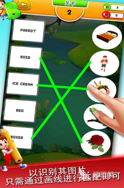 本作以视觉配对为核心机制,将常见英语词汇与对应图像精准关联。界面采用卡通风格设计,涵盖食物、动物、日常用品等多主题图库,玩家需在限定时间内完成单词与图片的正确连线。每组成功匹配均同步播放标准英式/美式发音,强化音形义三位一体记忆。支持亲子同屏竞速,提升互动参与感与学习持续性。