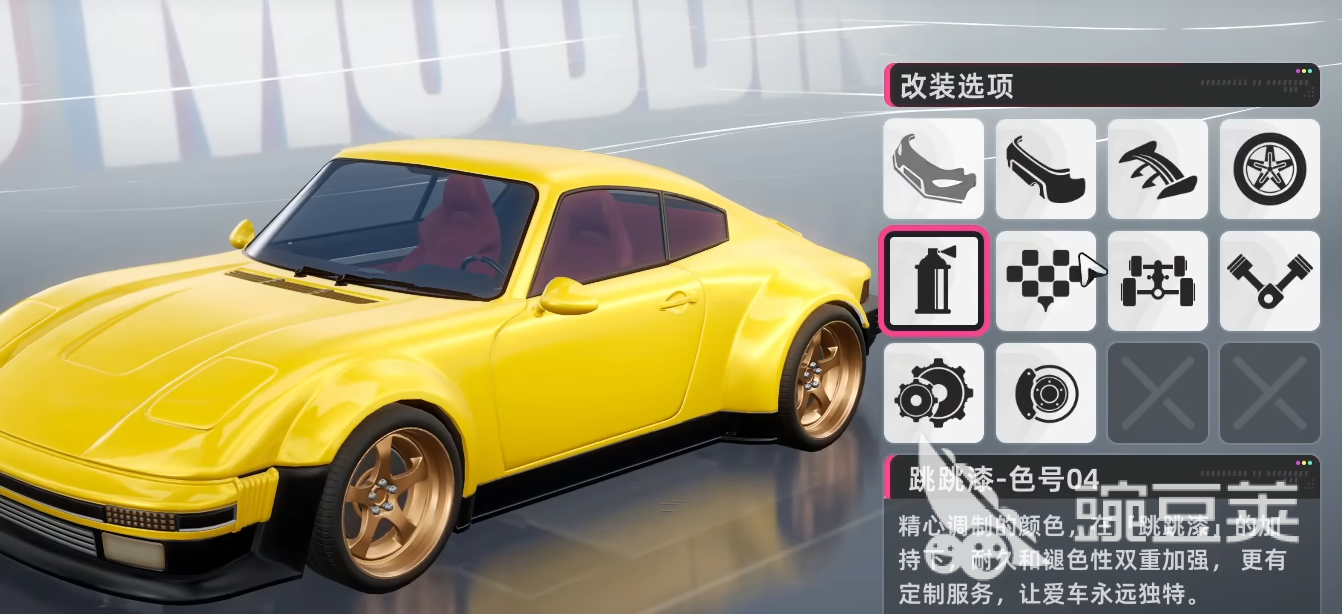 在改装界面中,底部设有“维修”与“改装”双功能按钮。“维修”可消耗金币恢复车辆至全新状态,修复因碰撞导致的外观损伤;“改装”则开放多项自定义选项,包括车身颜色重绘、前保险杠更换、尾翼加装等模块化升级,满足差异化审美与操控偏好。