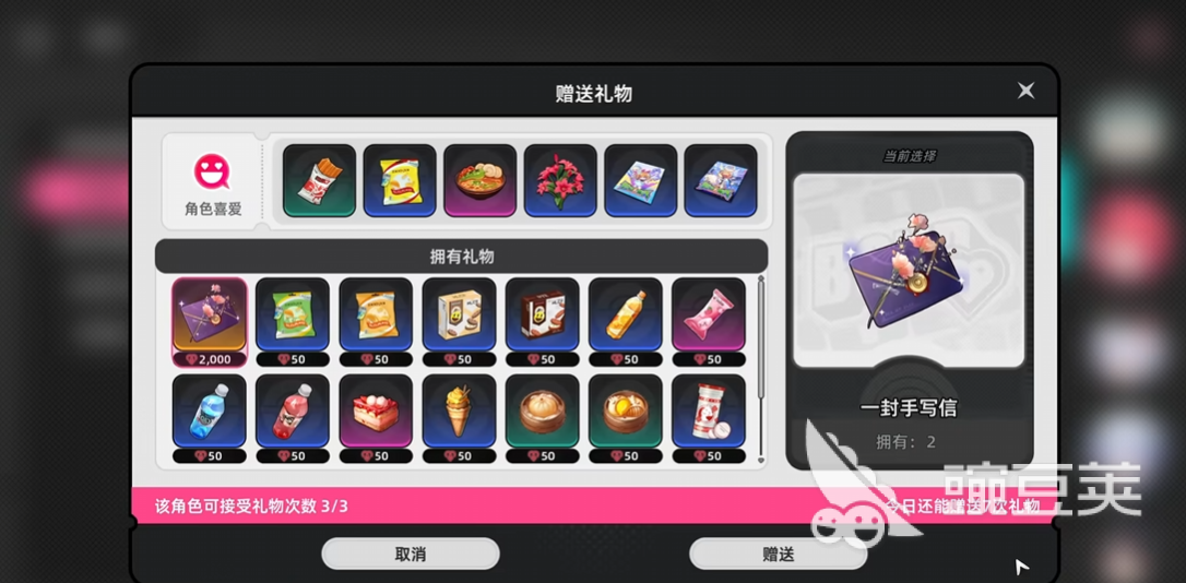 操作路径清晰直观:进入角色图鉴后点击目标人物头像(如娜娜莉),界面右下角会出现“礼物”图标,点击即可打开赠送面板。系统会优先在顶部区域高亮显示该角色当前偏好的物品类型,赠送契合度高的礼物将获得更高好感增幅;下方则罗列玩家已拥有的全部可赠礼物品,选中后一键送出即可完成交互。