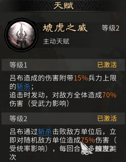 吕布的核心机制围绕“追击格子”展开:每次触发追击,均可造成基于自身武力值的额外伤害。其天赋可将普通攻击伤害的15%转化为斩杀附加效果;当进入斩杀阶段时,将对敌方全体目标施放一次70%武力系数的范围伤害。该数值受基础武力影响,上限固定为70%。更关键的是,此伤害前会激活【虓虎之威】状态——吕布需与敌方全部武将进行武力比拼,每胜一场即获得2点武力加成与1%斩杀上限提升,叠满四层后,整体输出能力实现质变跃升。