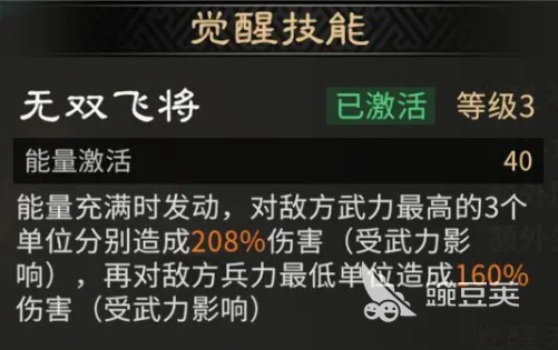 在觉醒技【无双飞将】加持下,吕布的能量充能完毕时,可对敌方物理属性最高的三名单位造成208%武力系数伤害;同时,对兵力最低的单位额外施加160%武力系数伤害。这一设计使其在面对高配敌阵时反而更具压制力,有效弥补单体爆发不足的短板,并通过锁定机制确保高伤精准命中关键目标。因此,前期若获取吕布,建议优先推进觉醒进程,以尽早释放完整技能链。