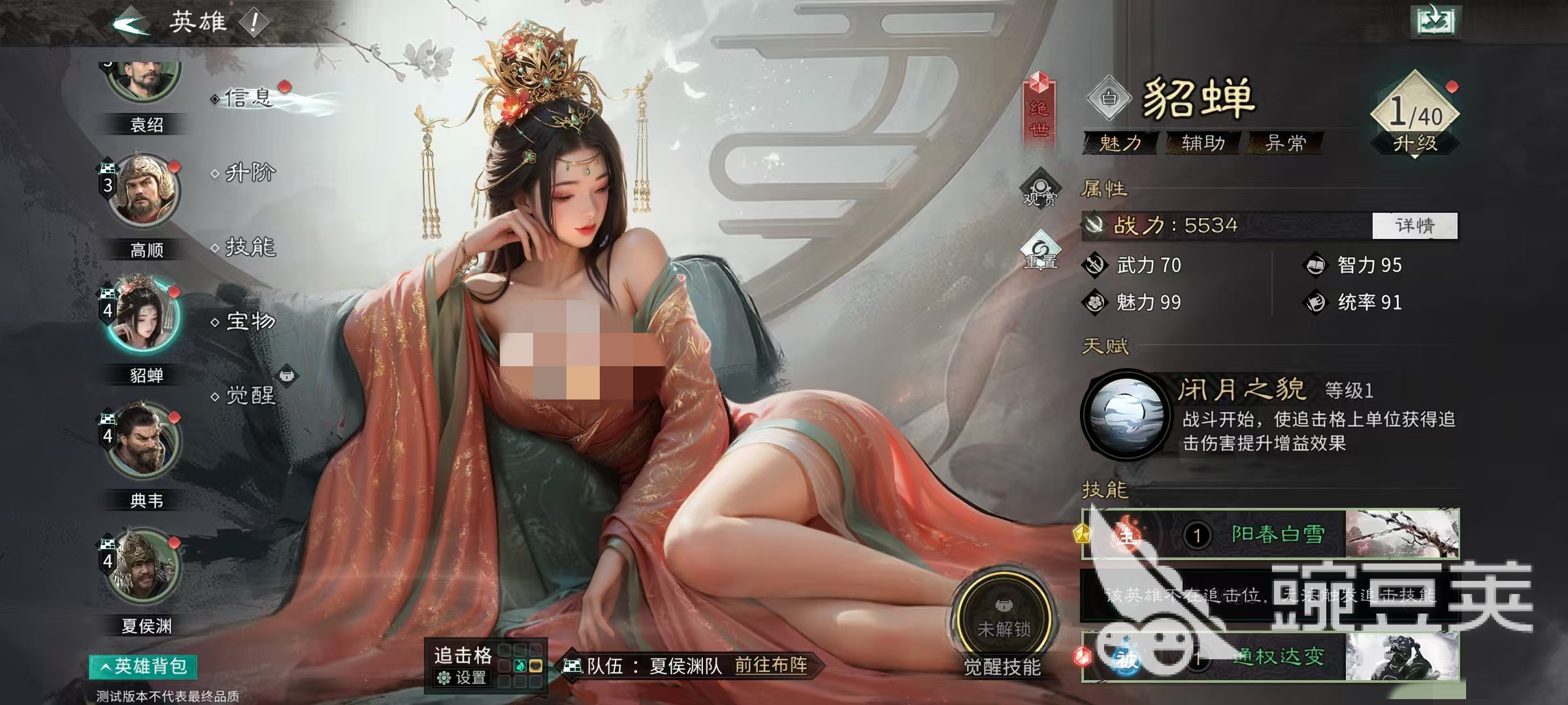 士兵配置方面,前排选用藤甲兵以增强前排承伤能力,后排部署穿杨军弥补远程输出缺口,形成攻守均衡的兵种结构。站位设计注重技能链协同:貂蝉需精准占据关羽与郭嘉的追击格,从而触发二次追击;关羽则踩踏貂蝉追击格,实时获取其天赋增益效果,确保每轮行动均能高效触发连携机制。