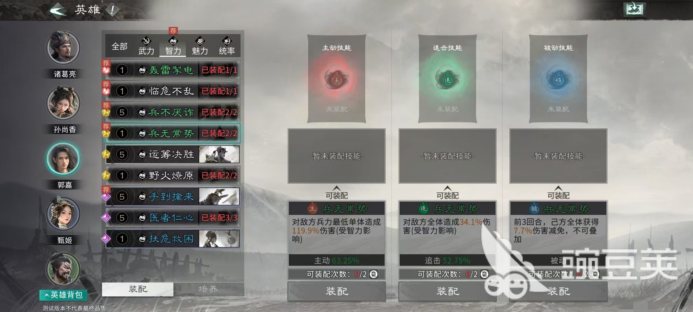 技能搭配上,郭嘉首选主动技【通权达变】,可随机削弱三名敌方单位攻击力,当敌方魅力低于自身时稳定附加混乱状态——鉴于郭嘉基础魅力值极高,该效果实际命中率接近100%;被动技推荐【兵无常势】,为全体友军提供可观减伤,有效提升队伍容错率。貂蝉技能组建议配置【通权达变】【临危不乱】【鼎力相助】,兼顾干扰、生存与辅助增幅;关羽则优先携带【万军取首】【齐射阵列】【兵不厌诈】,最大化其单体爆发、群体压制与战术机动性。