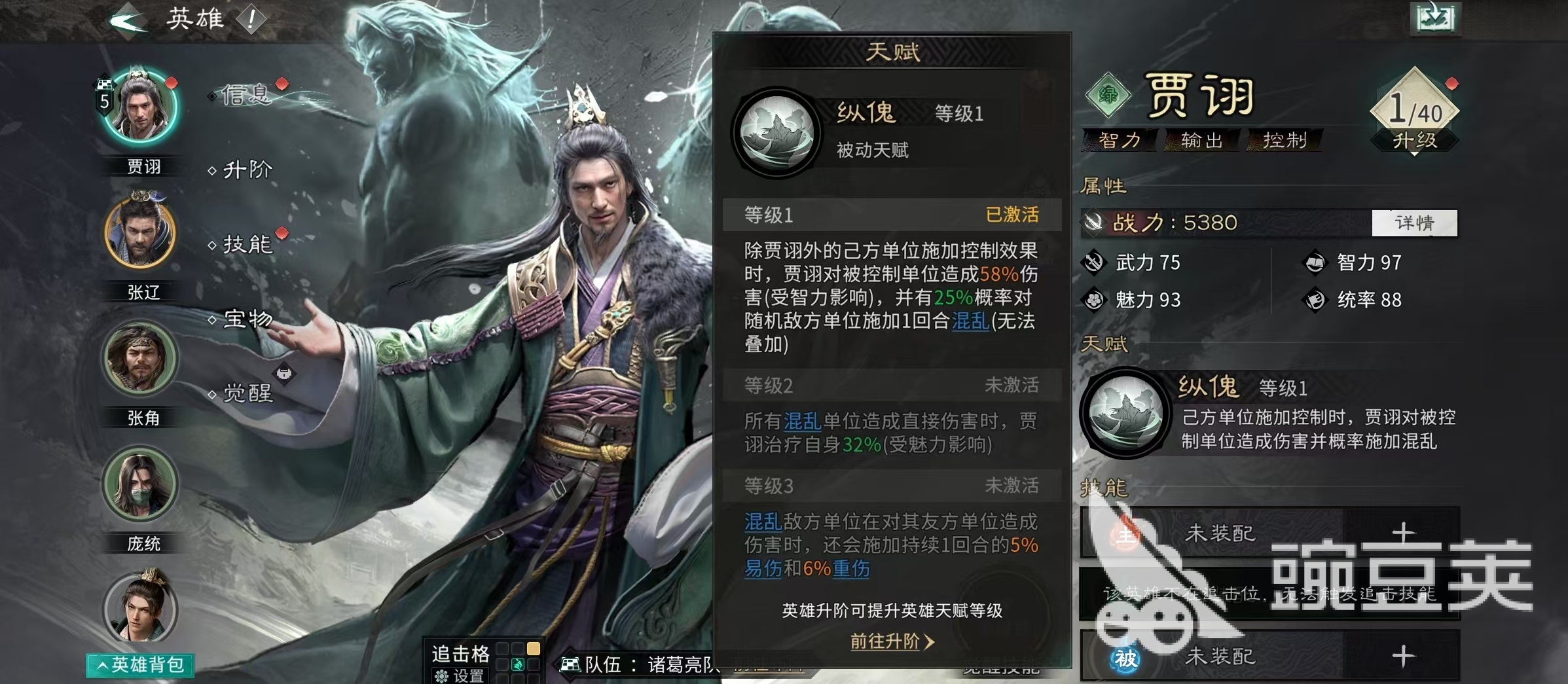 贾诩的基础属性以智力为核心,初始值与成长率均处于全武将梯队前列,确保其在中后期持续输出能力。真正决定其战略价值的是天赋效果:每当敌方或我方其他单位对目标施加控制状态(如眩晕、挑衅、技穷等),贾诩立即对该目标发动一次智力伤害,并有概率使一名随机敌方单位陷入混乱。混乱状态下,单位行动目标完全随机,可能攻击友军;更关键的是,所有混乱单位受到直接伤害时,贾诩可恢复自身生命;若混乱单位误伤己方,则目标将额外承受一回合易伤与重伤效果——这使得混乱不仅是干扰手段,更是持续压制与资源转化的关键支点。