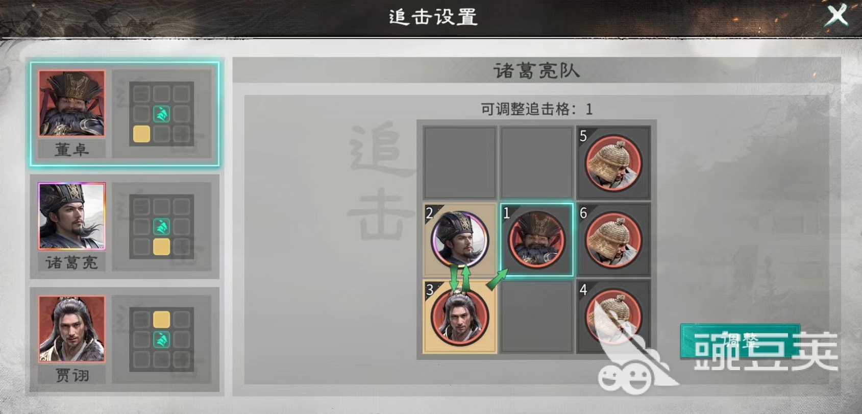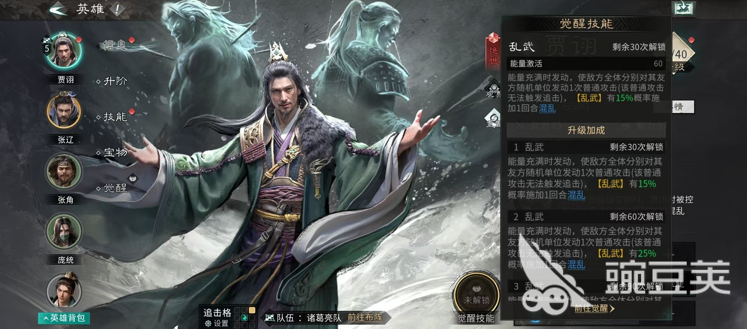 其觉醒技能进一步强化群体控场能力:对敌方全体发动一次强制普攻,攻击目标为该单位任意一名友方,且附带混乱概率。该技能与天赋形成双重触发链——队友控场→贾诩响应→敌方混乱→混乱单位误伤→贾诩回血+敌方减益。因此,贾诩并非独立作战型武将,而是高度依赖队友提供稳定控制频率的“控场放大器”。当前环境中最成熟的解法是“三控铁壁阵”:由诸葛亮、贾诩、董卓组成核心三角,前排配置三名藤甲兵承担承伤职能,董卓居中后排抗压,诸葛亮与贾诩置于最后两排,确保站位满足追击触发逻辑与生存安全边界。