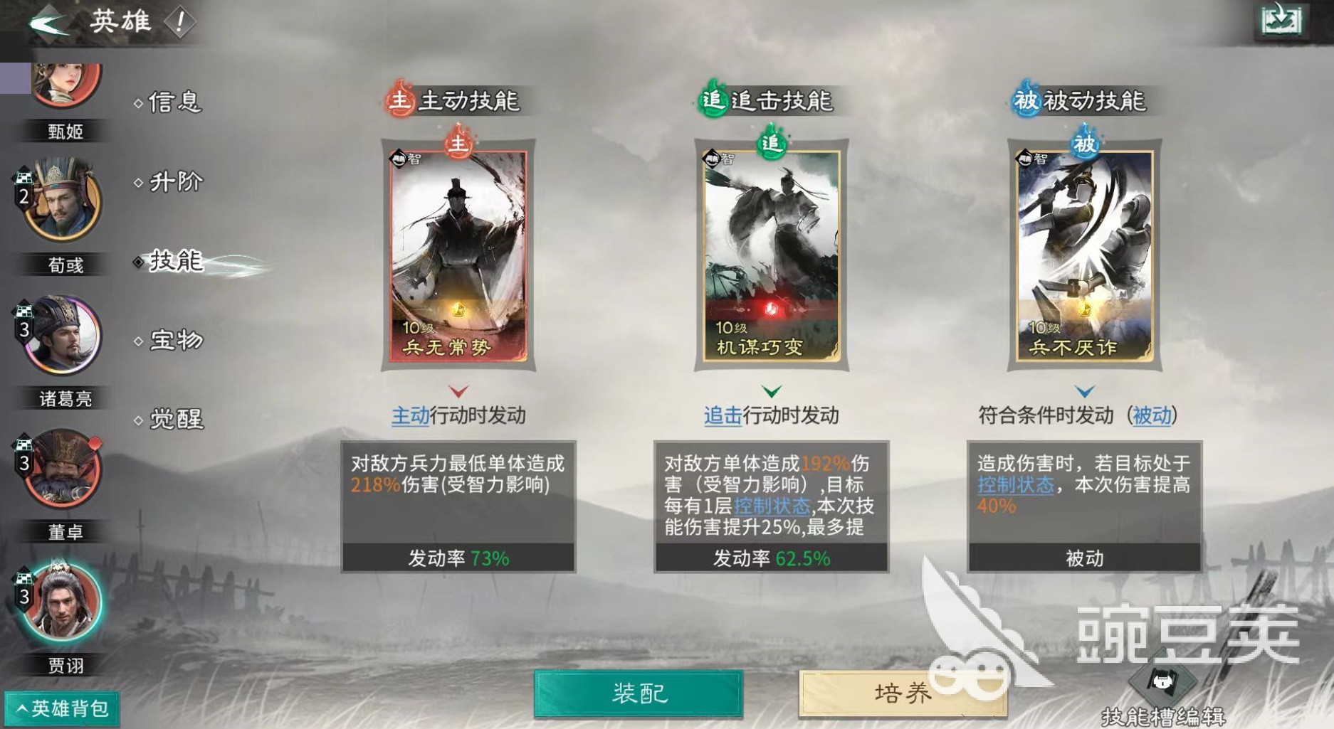 实战中,董卓通过天赋对随机敌方造成伤害并附加挑衅(属控制类状态),既触发贾诩天赋,又限制敌方集火方向;诸葛亮则在敌方行动后发动反击,进行智力比拼,胜者施加技穷(亦为控制状态),持续扩大控场覆盖面。在此基础上,技能配置需严格服务于控制链闭环:诸葛亮携带机谋巧辩、反间计、兵不厌诈,强化智力压制与反制节奏;贾诩选用兵无常势、机谋巧辩、兵不厌诈,兼顾伤害补充与混乱覆盖率提升;董卓则配置首尾相援、缮甲厉兵,专注生存与嘲讽稳定性,主动规避追击类技能以保障前排站位完整性。