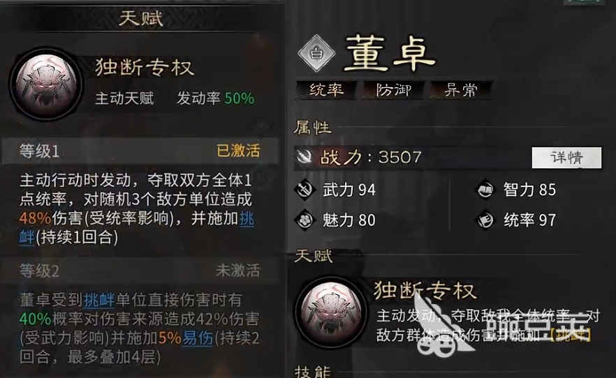董卓的核心优势源于其天赋体系:主动行动时,可同步夺取敌我双方统帅属性,并对三名随机敌方单位造成伤害,同时施加挑衅状态。这一机制使其天然承担前排诱敌职责,有效保护后排输出单位。当天赋升至二阶后,触发机制进一步深化——每当被挑衅目标攻击董卓时,有概率反制并附加易伤效果,显著提升己方主力输出的单位伤害转化效率。因此,在布阵实践中,董卓通常部署于前排中央或侧翼,重点确保其追击格覆盖主C武将,自身则无需刻意占据他人追击路径,操作容错率高,上手门槛低。