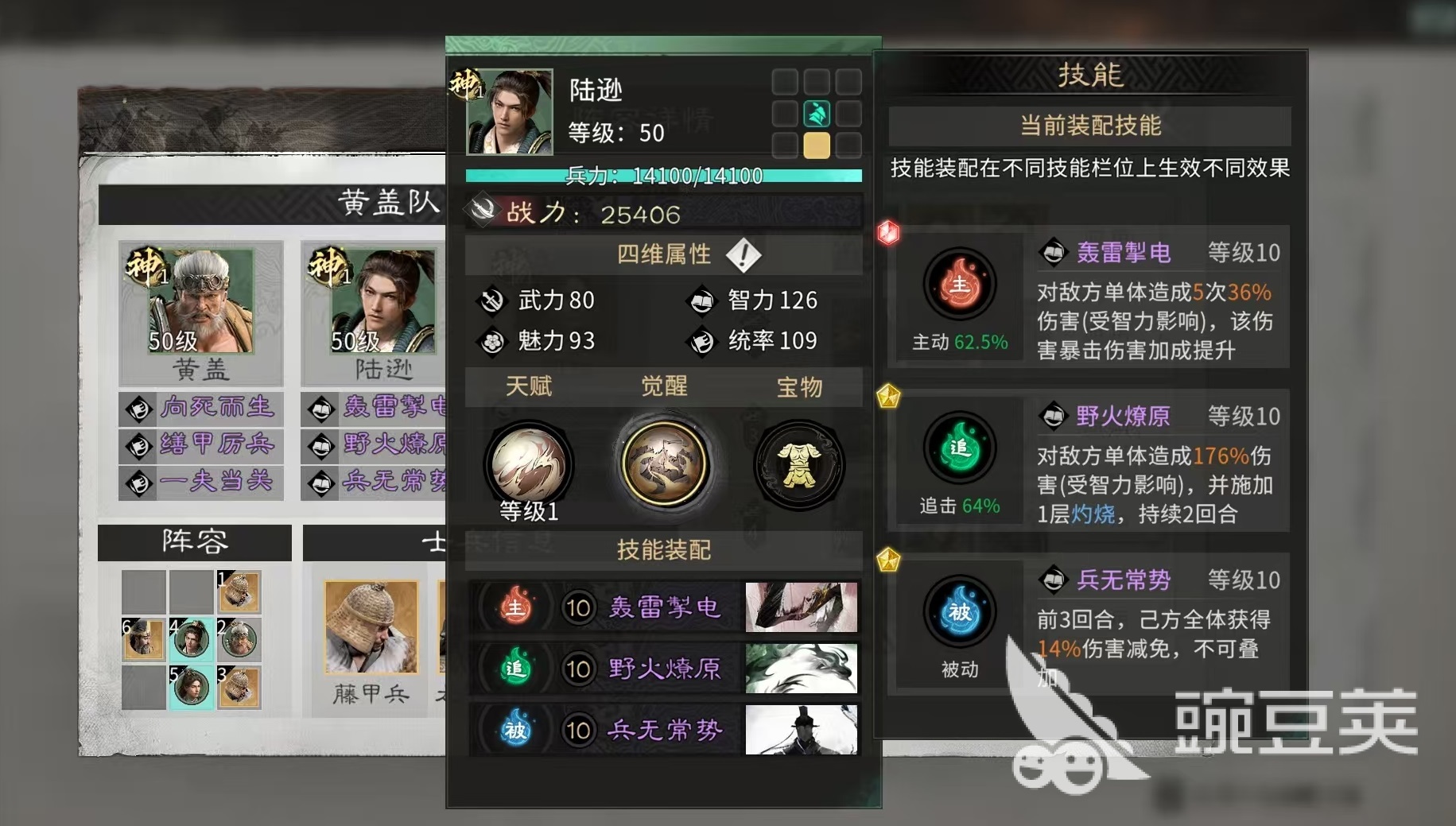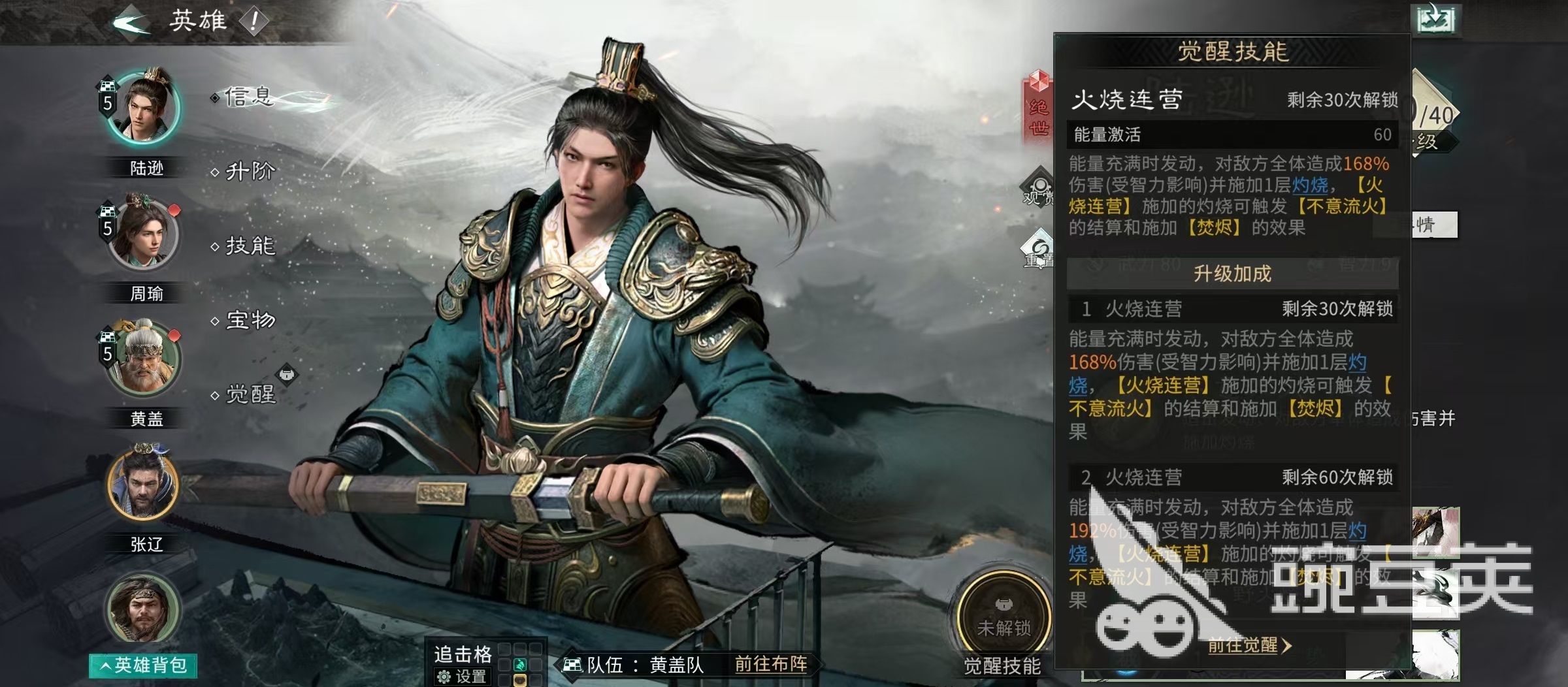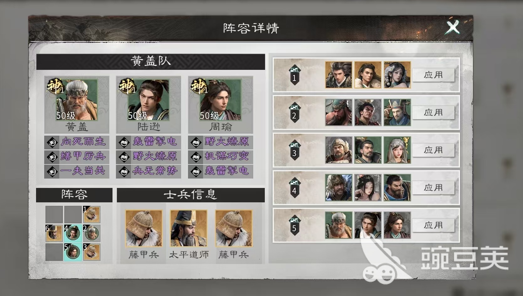 其觉醒技“火烧连营”可对敌方全体造成范围伤害,并统一附加一层灼烧——该灼烧可完整触发天赋的四层结算与焚烬扩散效果,极大提升了AOE灼烧启动效率。因此,陆逊最成熟的配队方案即为“东吴灼烧三巨头”:陆逊、周瑜、黄盖。推荐技能配置如下:陆逊携带轰雷掣电(单体5段高频伤害)、野火燎原(追击型单体灼烧)、兵无常势(被动,提供全队减伤);周瑜搭配野火燎原、机谋巧变、轰雷掣电;黄盖则选用向死而生、缮甲厉兵、一夫当关。兵种配置为藤甲兵×2 + 太平道师×1,布阵上将两名藤甲兵与黄盖置于前排中央,陆逊与周瑜分列中后排,太平道师压轴后置,确保灼烧传递链路稳定、承伤结构合理、输出节奏紧凑。
