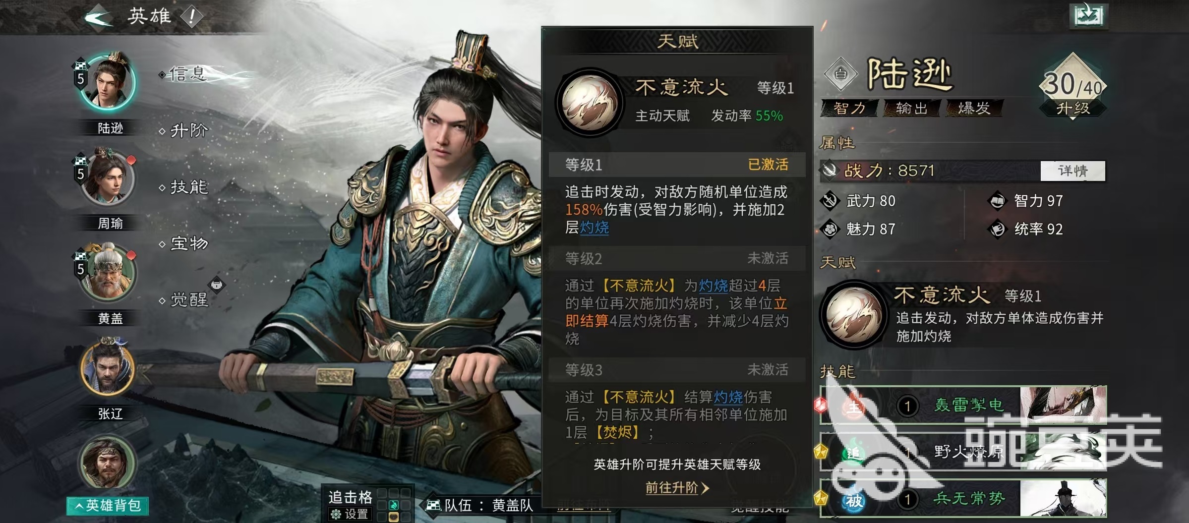 陆逊是三国题材策略手游《三国天下归心》中极具战略价值的核心武将之一。作为红色绝世品质角色,他以超高的智力属性著称,定位为高爆发、强持续伤害的法术输出型将领,尤其在灼烧体系中占据不可替代的地位。本文将从技能机制、实战表现与阵容协同三个维度,系统解析陆逊在当前版本中的实际强度与应用价值。