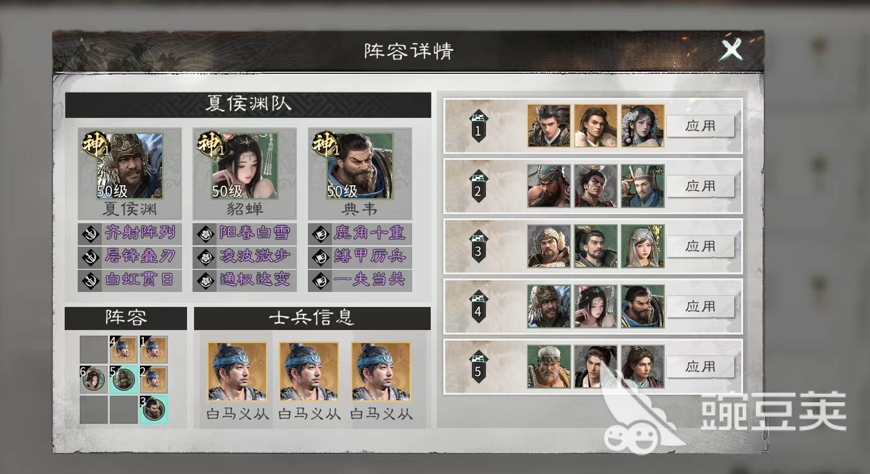 阵容搭配上,建议以典韦为核心构建“双骑一辅”体系:前排部署典韦+两名白马义从,承担主要伤害并激活骑兵协同效果;中排配置夏侯渊与一名白马义从,利用其追击天赋高频触发破甲与单体爆发;后排安置貂蝉,提供控制衔接与状态干预。白马义从作为高机动骑兵兵种,不仅补足前排硬度,更通过兵种特性强化整体输出节奏,使典韦的反击触发频率与团队输出效率同步提升。