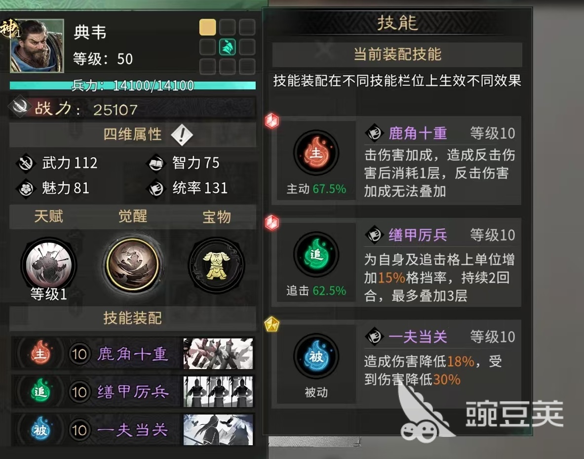 在技能配置方面,推荐采用【鹿角十重】【缮甲利兵】【一夫当关】组合。其中【鹿角十重】作为主动技,直接强化反击伤害,放大典韦的反制输出能力;【缮甲利兵】为追击技,同步提升自身与追击格单位的格挡率,进一步巩固保护链;【一夫当关】作为被动技,在降低所受伤害的同时,也压缩自身被集火风险。若阵容偏重爆发输出,可将【一夫当关】替换为更具进攻性的替代技能,但需注意平衡承伤稳定性。