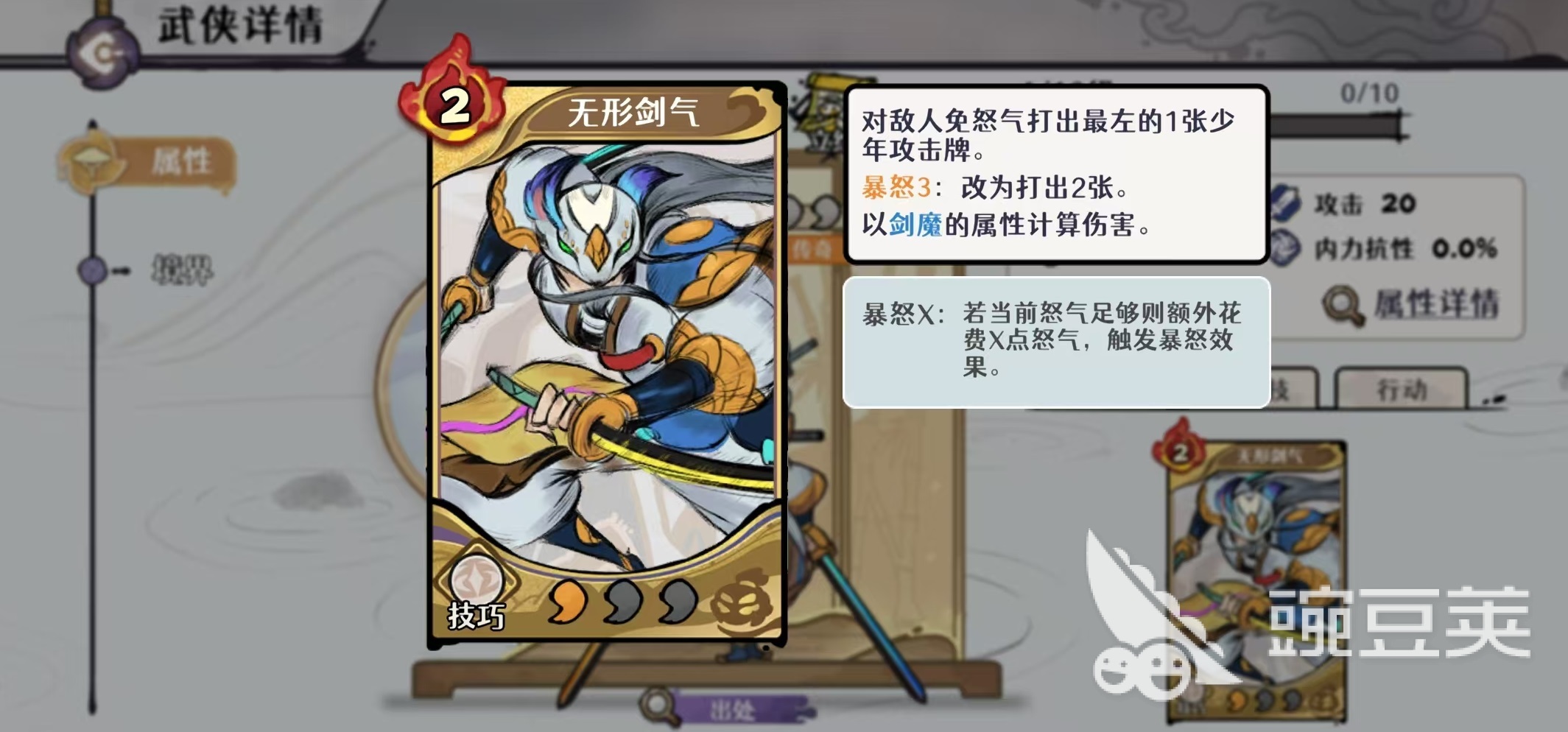 剑魔的核心机制围绕“高频循环+伤害叠加”展开:其真气技能可对敌方造成外功伤害,且本回合每消耗1点怒气,即额外附加1段外功伤害;武学“无形剑气”默认触发最左侧少年攻击牌,若处于暴怒状态,则自动替换为连续打出两张同类型攻击牌。该设定使其在怒气管理得当的前提下,具备极强的单体压制力与稳定清场能力,下限高、上限足,一拖二表现尤为突出。