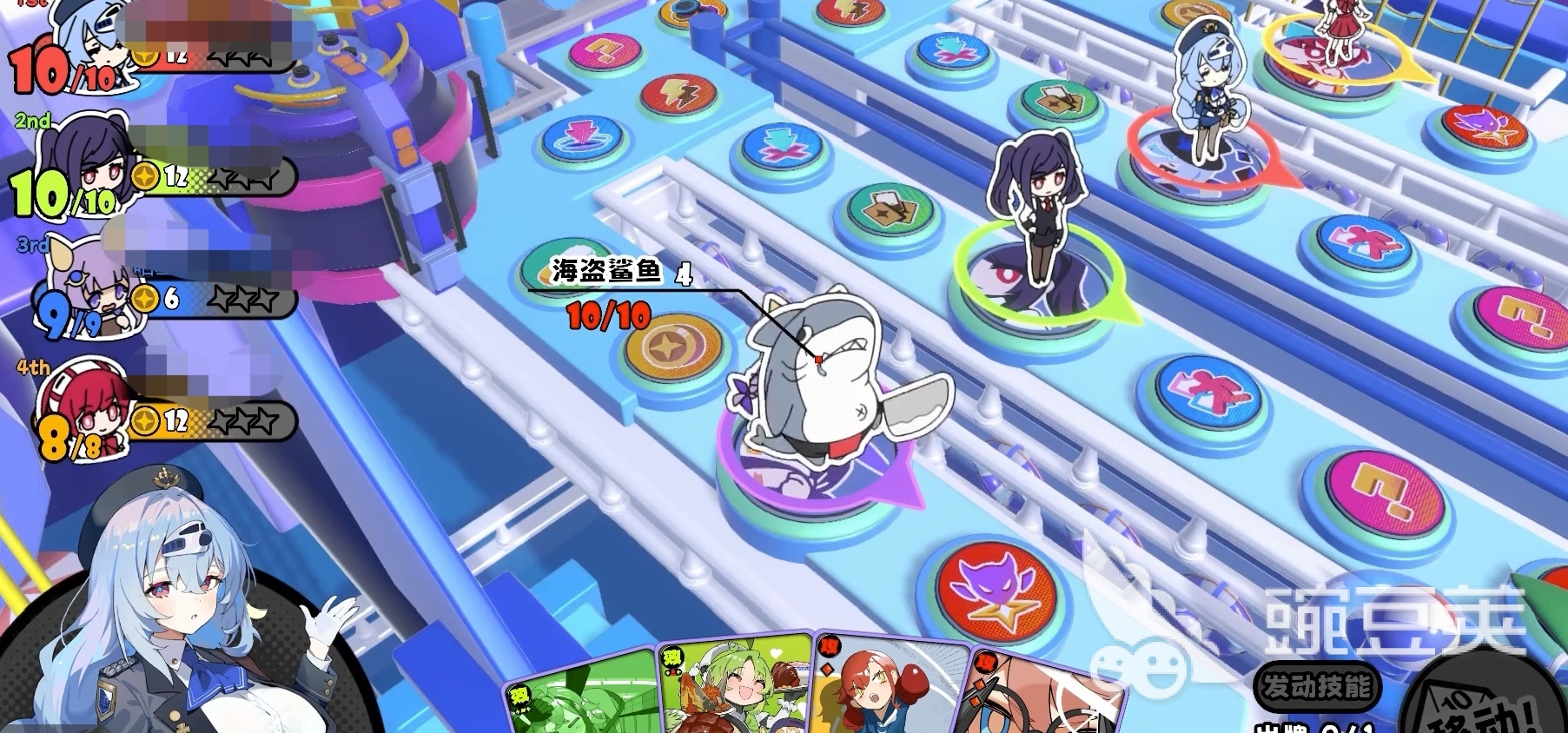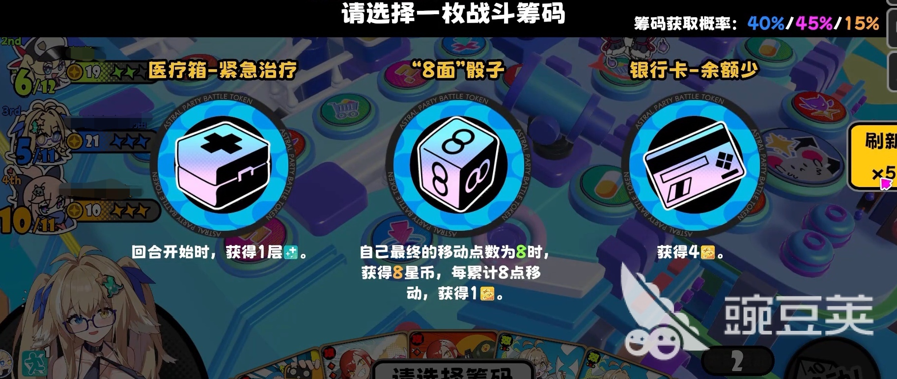 【虚弱印记】作用于单个怪物,同样维持2回合,被标记单位每次受击时伤害+1;若其在此期间被击倒,则蓝海晴额外获得3星币。该技能强调协同输出节奏,适合配合高爆发队友快速兑现收益。其被动【幸运点】则在蓝海晴当回合移动点数恰好为6时自动触发,稳定提供6星币,构成可持续的资源循环基础。