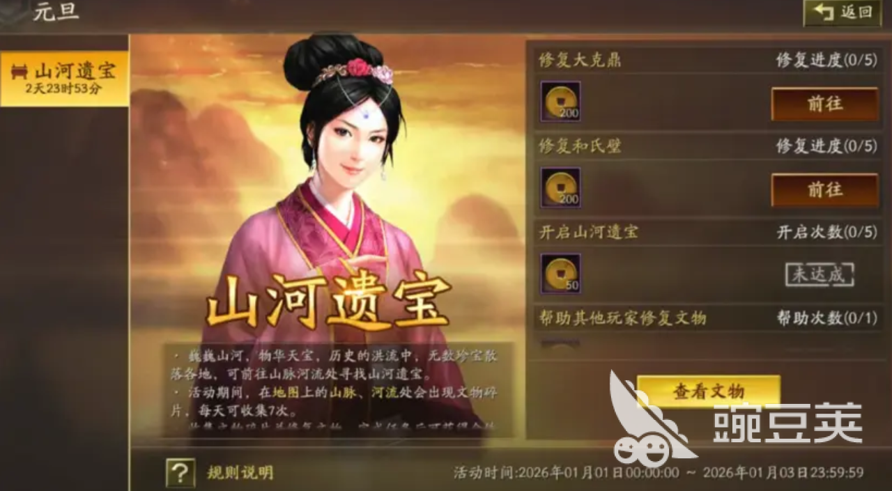 “山河遗宝”活动将于2026年1月1日0点至1月3日24点限时开放。参与资格以历史势力值≥300为唯一门槛,满足条件即可进入活动地图。每日凌晨0点,系统将在全服地图的山脉与河流区域随机刷新遗宝点位,玩家点击开启即可获得文物碎片。每位玩家每日可开启遗宝上限为7次,达到指定开启次数后可领取阶段奖励。