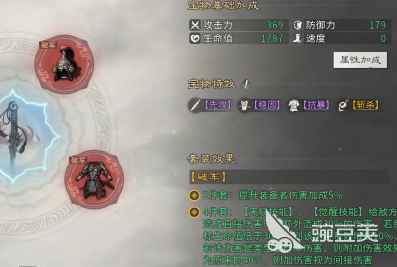 觉醒资源分配上,吕布必须列为最高优先级。觉醒后,其单体伤害系数获得质变提升,可大幅缩短敌方减员周期,提前开启收割节奏,在PVP与高难度副本中均具备战术决定性。宝物系统是本阵容强度跃升的关键支点——吕布必选【破军】四件套:两件套提供5%基础伤害加成,并额外赋予30%伤害提升;当目标生命值低于30%时,再叠加10%伤害增幅,完美契合斩杀场景。副属性需集中堆叠暴击率与穿透率,最大化极限爆发阈值。