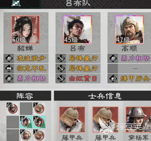阵容主轴以吕布为绝对输出核心,其伤害转化效率直接受限于辅助角色的属性压制效果。高顺需确保统帅属性全面超越敌方全体武将,从而激活其被动技能的群体增益;貂蝉则必须维持魅力属性压制优势,以此触发关键控制与连携效果。为达成这一目标,须为其二人配备可快速堆叠对应主属性的优质装备,避免属性断层导致追击链中断。兵种组合推荐采用“藤甲兵×2 + 穿杨军×1”的配置:双藤甲兵显著提升前排承伤韧性,保障辅助存活率;穿杨军则强化物理穿透能力,使吕布的单体爆发能有效穿透敌方防御,提升实际斩杀效率。技能方面,吕布首选【白虹贯日】,该战法不仅提供高额单体伤害,更可稳定触发追击机制,是支撑6次追击循环的核心技能节点。