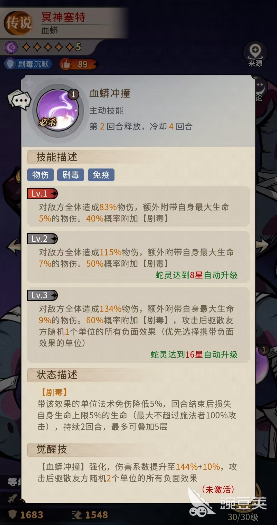 需明确的是,冥神塞特虽属传说品质,但其暗属性天然享有属性压制优势——在当前版本中,暗系与光系角色的基础强度普遍高于火、水、风三系,这使其实际战力基准线显著高于同品质非双系角色。其核心定位并非传统反伤或嘲讽型坦克,而是兼具承伤、控场与体系赋能的复合型前排。一技能为单体物理伤害,并附加【剧毒】状态:该效果可降低目标5%法术免伤,且每层在回合结束时造成自身最大生命值5%的真实伤害,最多叠加5层。该机制与游戏中多个自带剧毒的角色形成天然协同,能加速层数累积节奏,提升整体队伍的持续压制能力。
