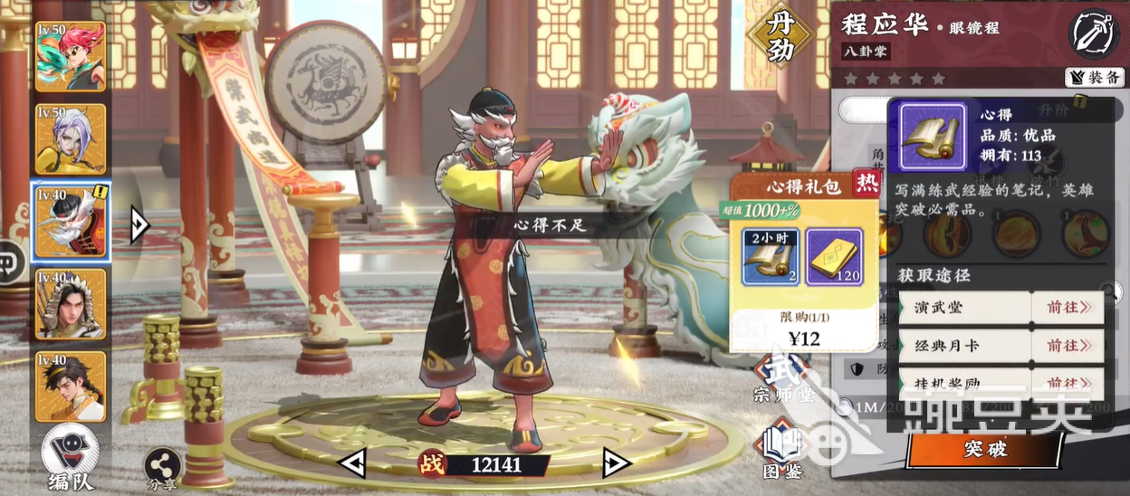 因其标志性眼镜造型,玩家常称其为“眼镜程”。其专属绝学为八卦掌,该技能可与兰陎的招式形成战术配合,实现技能衔接增益。实战中需依据敌方阵型动态调整程应华站位,以最大化输出覆盖与控制效果。角色升阶需累计5星方可进阶,每次突破均同步提升生命、攻击、防御三项基础属性。建议优先提升其等级,既可强化单体爆发,亦能承担全队核心输出职责,战力成长曲线更为陡峭。