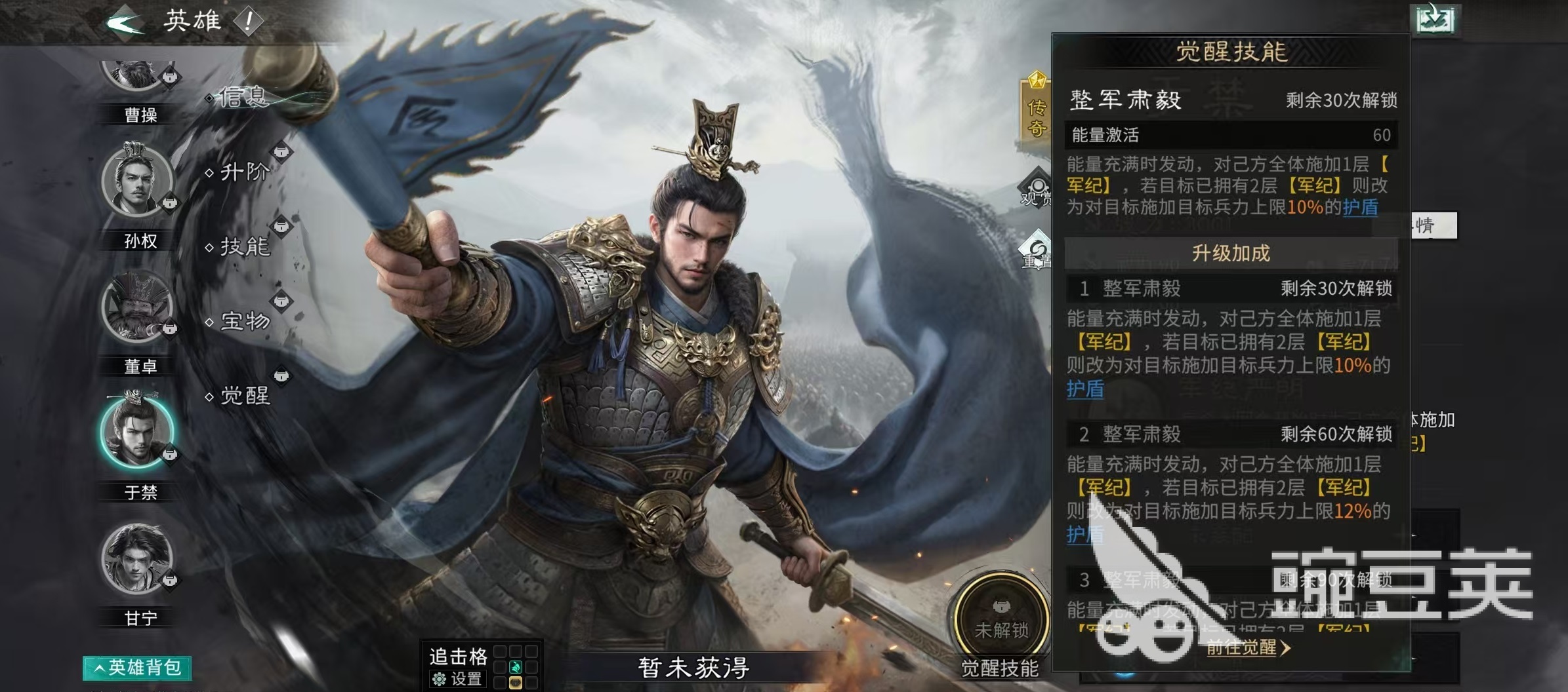 于禁的核心定位为防御向统帅,四维属性中统率值最高,直接强化其承伤能力与持续作战韧性。其天赋【军纪严明】具备全局性辅助效果:每个大回合开始时,为全体友军施加“军纪”状态,提升格挡率及格挡减伤效果;当统率每提升4点,每层军纪所增加的格挡率还会额外提升;更关键的是,任一携带军纪的单位兵力首次跌至30%以下时,将立即触发“镇定”效果,恢复一定兵力——这一机制兼顾保护与续航,显著延长前排生存周期。