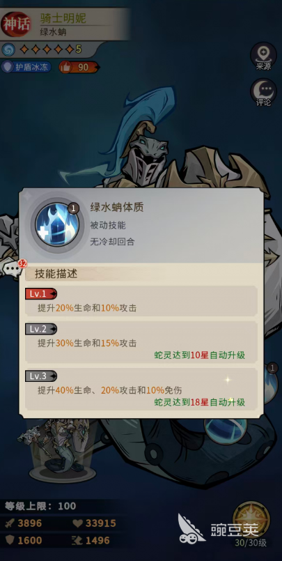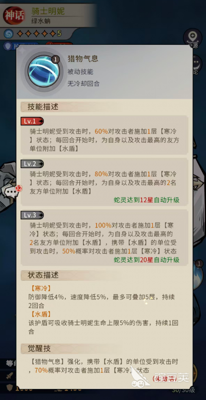 而绿水蚺体质这个被动是让他提升20%生命和10%攻击,在蛇灵达到18星自动升级提升40%生命、20%攻击和10%免伤,机制非常的简单,但是其中的免伤也是骑士明妮比较需要的。最后就是猎物气息这个被动,这个被动技能是一般在骑士明妮受到敌人攻击的时候可以成功触发到的,其中会有60%的概率对此时的攻击者施加1层【寒冷】的状态,所以就算没有其他队友给骑士明妮一起配合施加寒冷,前期只要保证这个技能能够触发,骑士明妮后期的冰冻也可以用出来。