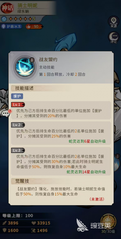 骑士明妮第一个使用的一般是战友盟约这个技能,作为主动技能可以在第1回合释放,释放十周是优先为己方后排生命百分比最低的一个队友,带来【援护】的效果,用来分摊这个队友受到的20%的伤害,所以可以当做前排的援护技能使用,而在蛇灵达到14星的时候可以自动升级,此时达到3级的技能效果是优先为已方后排生命百分比最低的2名队友施加【援护】,分摊的伤害也是有所提升,此时分摊的是2名受到的30%的伤害,而且如果此时骑士明妮生命值是低于50%的情况下,他还会恢复自身10%最大生命数值,所以骑士明妮可以放在前排用,不光是分摊的数值不低,也可以带来不错的自我恢复,虽然恢复的数值不算很高,但是前期奶妈强度没有培养出来之外,他会比其他的前排角色有更多的场上生存机会,而另外在骑士明妮觉醒之后,这个战友盟约的技能会有所强化,此时在施放技能时,如果是骑士明妮生命值低于50%的情况下,会恢复自身15%最大生命,此时基本就可以保证他的生存强度了。