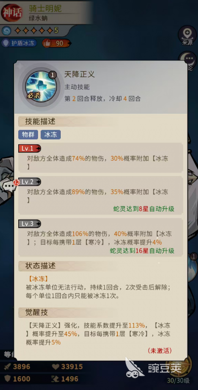 而另外天降正义这个大招也是骑士明妮最重要的一个群体能力,此时使用的话可以对敌方全体敌人都带来物理伤害,造成74%的伤害之后,他还有30%概率可以附加【冰冻】的效果,让对面的敌人无法继续行动,虽然是物理群攻的能力,但是冰冻效果也是在这个技能中更容易造成的控制的,而且这个技能在后期升级之后可以对敌方全体造成106%的物伤,此时就有40%概率附加【冰冻】,如果在此之前攻击的的目标身上有寒冷状态的话,那么每携带1层的寒冷,这里施加冰冻概率就会提升4%,而在觉醒之后的天降正义能力也会提升很多,此时的技能数值基础是提升到了113%的输出,而在【冰冻】的概率上面是提升到了45%的数值,而且在攻击的目标身上每携带1层【寒冷】的时候,骑士明妮造成的冰冻概率还能再提升5%,所以前期大家如果用骑士明妮想要快速控制住对面的话,最好队伍当中有一个可以施加寒冷状态的角色,跟骑士明妮一起搭配就可以成功的用多层冰冻控制对面的行动啦。