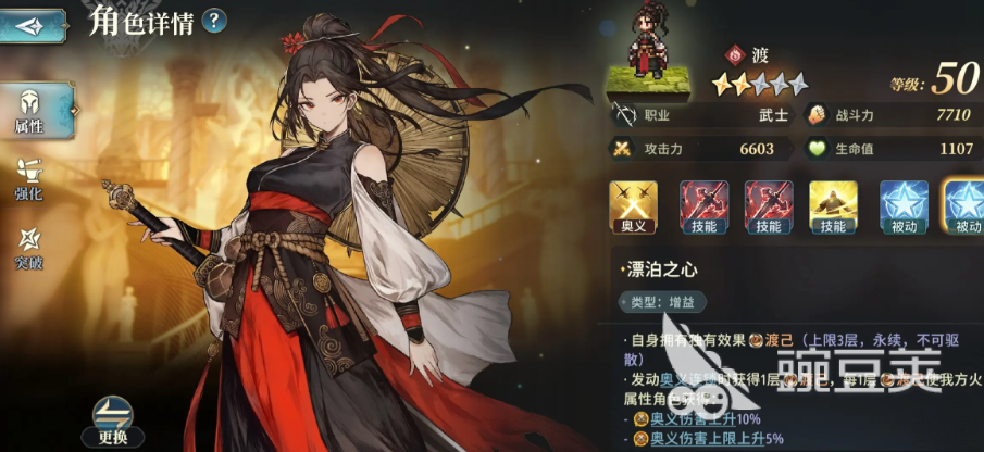 次要的C位角色,可以使用渡,其角色定位是武士,同时附带有很强的技能强化被动,可以根据自身拥有的标记数量,来增加奥义伤害和奥义伤害上限,整体技能输出可圈可点,虽然前期的表现不佳,但是在后期的叠加到指定层数后,可以得到强化的输出转化率。