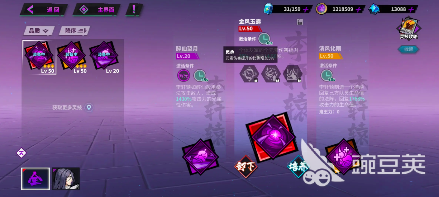 绝技——”断罪“,被绝技时停结界影响的敌方目标,受到的全伤害增加15%。除了这种基本的学习绝技后,当夏玲融合了葫芦变作sp夏玲,也就是清风夏玲,在绝地方在绝地方也会有着在绝技方面会有着更强的突出表现,玩家可以直接解锁万象天移这一主角技能和逆转时间的绝技,至今能够对敌方发起控场,延缓敌方的移动速度,从而为输出型的队友提供更加稳定的输出空间。