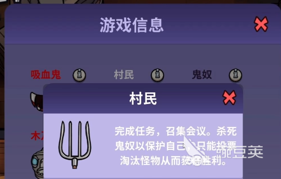 在这个玩法中,如果玩家是村民,那只需要按照游戏里的要求完成特定的任务即可,在这个过程中,每完成一项任务,倒计时就会缩短,之所以要把时间变短,主要是为了限制对方行动,但觉得时间越短,怪物可以行动的时间就越紧张,能让成员有更多的存活机会,如果玩家扮演的是怪物,那就需要在游戏里保护自己的身份不暴露,另外还需要再发现其他村民做任务的时候,及时出现吃掉这些角色,每个玩家都能选择僵尸或者吸血鬼两个身份,但切换成僵尸之后会有5秒钟的缓冲时间,需要尽可能保证身边没有其他的对手。