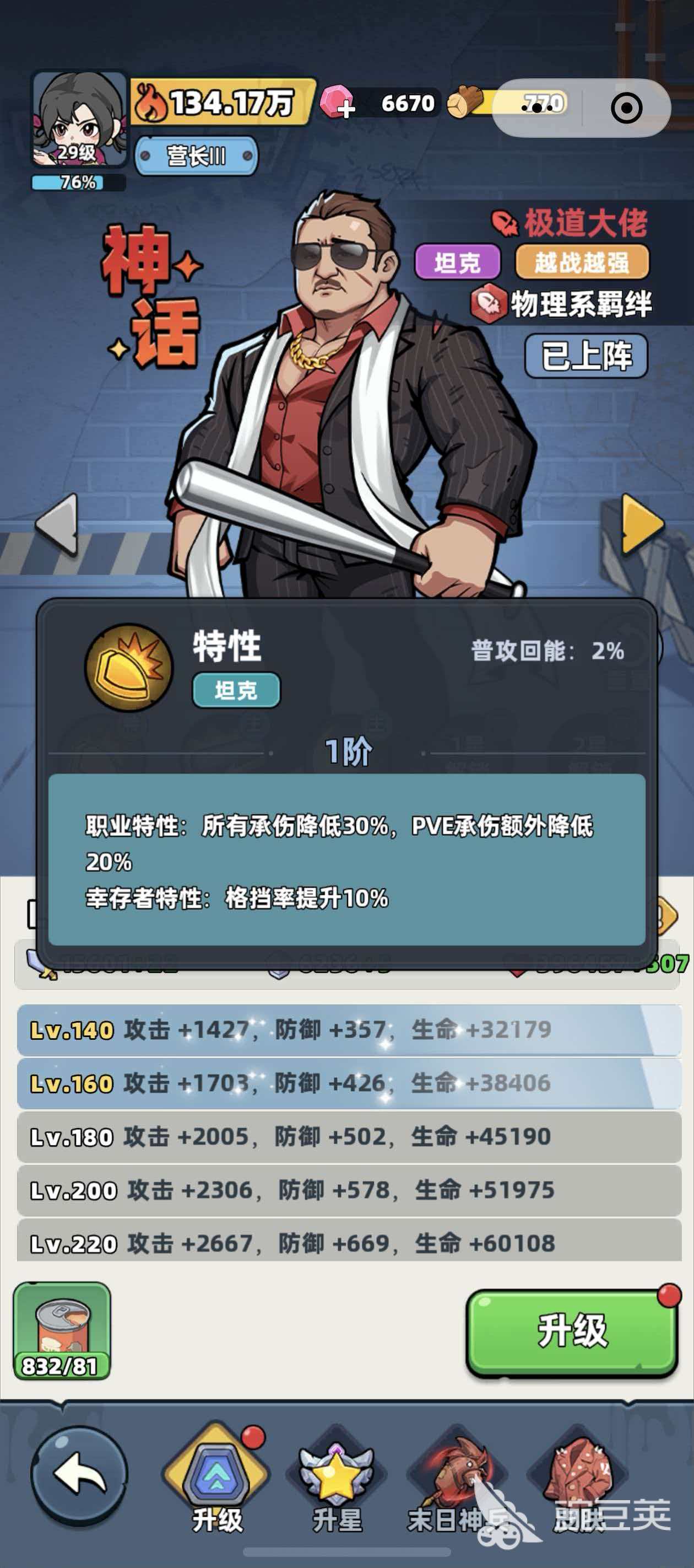 以上就是生存33天极道大佬的角色介绍了,对于平民玩家来说,极道大佬在游戏前期是一个非常不错的坦克型角色,角色自身的能力出众,而且在阵容组建上还比较容易成型,最重要的一点是极道大佬非常容易抽到,英雄的适配性非常的高。