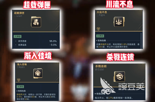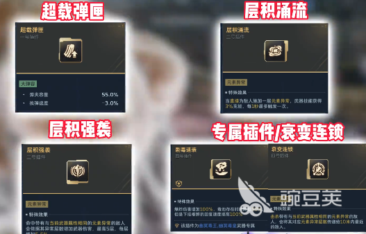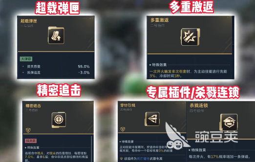第4个是幽冥毒王,这把枪的输出能力要比之前的这几个稍微低一些,但核心的优点就在于强调团队的配合,可以给队友带来强大的辅助增益。在团队中也是核心的优势,插件方面建议选择层级涌流,还有杀戮连锁。一方面可以延长持续的时间,更快的消耗敌人的生命值,另外一方面在叠加之后也会拥有可观的伤害,可以带来更加出色的辅助能力。