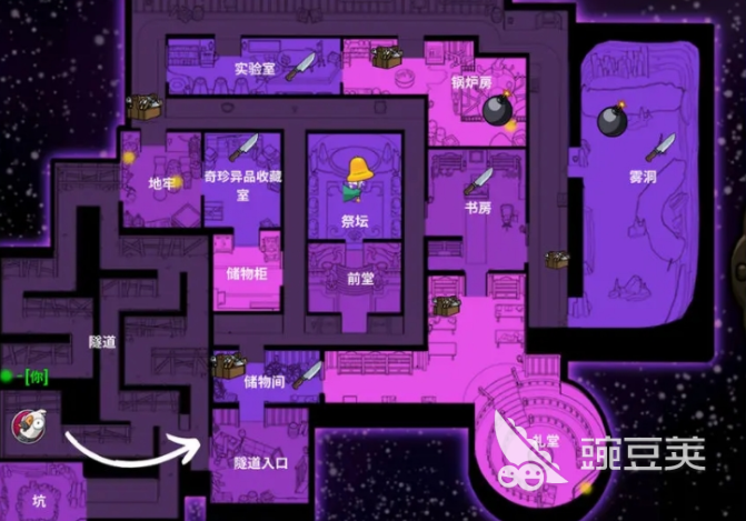 整个地下室设定的布局相对比较整齐,但在里面会有一些黑暗区域,首先最需要了解的就是整个游戏里的拉铃点,一旦发现尸体之后需要快速去这个位置,通过拉铃才能召开会议推理案件,每个角色都只有一次拉铃的机会,拉铃位置就在整个游戏的中心祭坛区域,到达这里之后就能看到铃铛的位置,接着还会有实验室,储物间和书房这样的区域,鸭子阵营需要去实验室关闭灯光,一旦关掉灯光之后,整个场景会更黑暗,每个成员的观察视野都会受限,可以在这个时候寻找落单的鹅阵营角色杀害,所有成员都可以点燃场景里的固定灯光点,照明对应的区域,如果在这个期间出现尸体有成员拉铃,那会议结束之后,灯光就会重新开启。