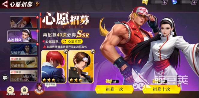 英雄搭配的核心就在于激活羁绊,还有灵活的组合。很多英雄之间都有特殊的羁绊,例如夏洛特和玛丽一起上场,可以提升前排的格挡,中排的暴击,还有后排的闪避,效果是比较出色的。初期推荐直接选择初阶女团队,这套阵容获取难度比较低,羁绊还可以全额的激活,能够轻松的应对初期的关卡。随着游戏的推进,可以根据战斗的环境去调整阵容,例如竞技环境,可以选择初阶点杀队。将牙神作为核心,然后逐个去打败敌人。面对高防的敌人时,可以选择初阶异常队叠加波动效果,还有雷霆,可以直接无视防御的伤害。等到招募标准达到100次之后,就能解锁心愿招募,建议先选择八神庵。