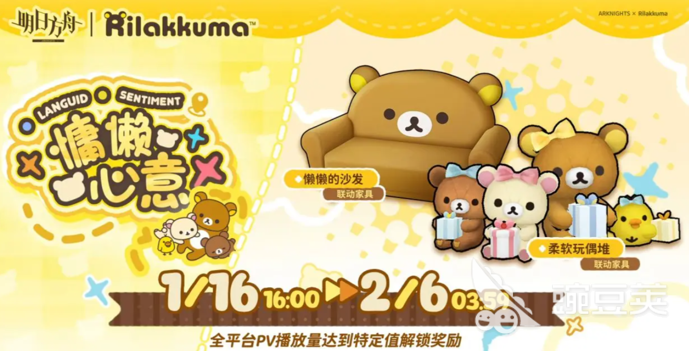 明日方舟×轻松小熊联动活动将于1月16日正式开启,持续至2月6日。本次合作以“慵懒治愈”为主题,为玩家带来一系列限定内容与专属福利,涵盖家具、玩偶组合包、时装、名片主题及养成资源等多重奖励,是新老玩家不可错过的萌系联动体验。
