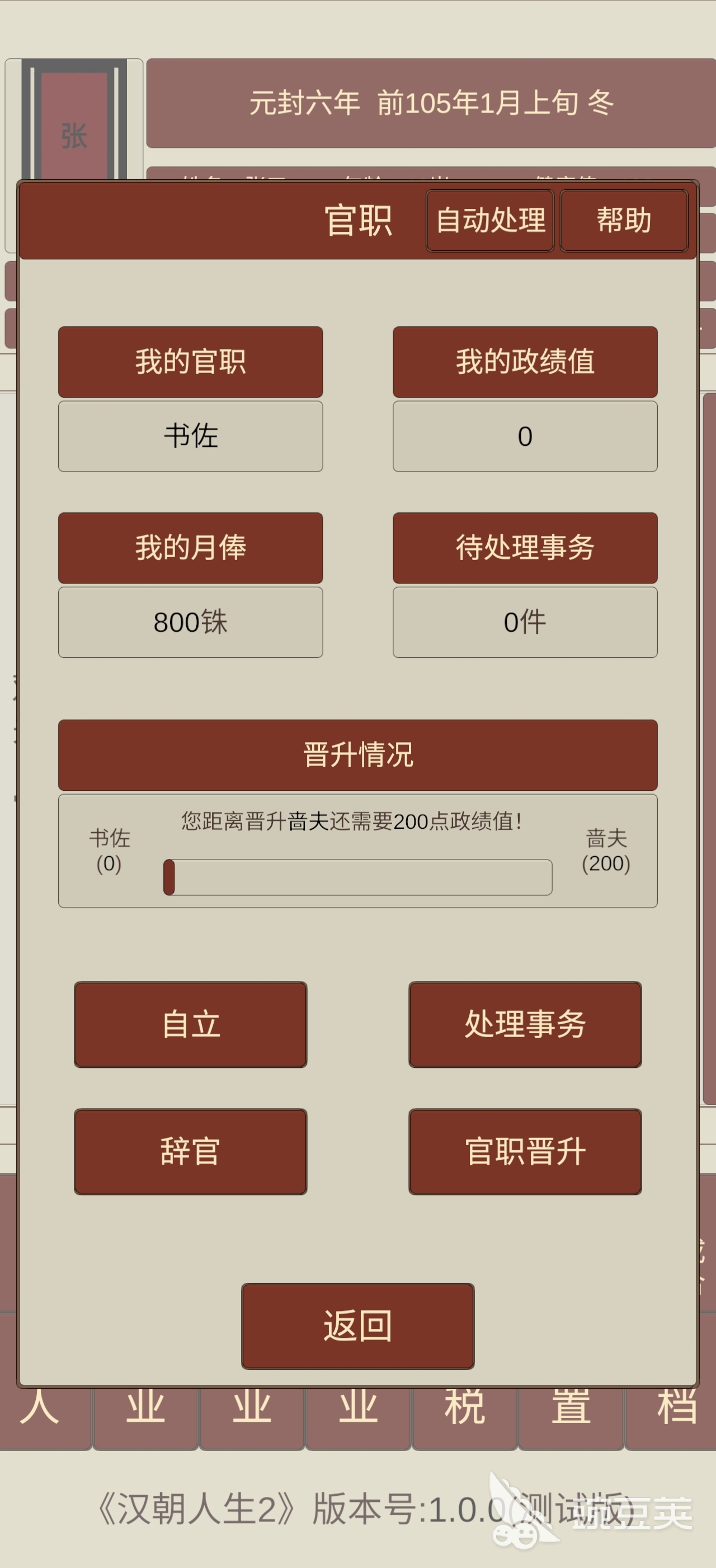 本作以西汉时期为舞台,是一款聚焦家族世代传承的文字模拟经营类单机游戏。玩家起始于平民身份,可自由选择务农、经商或科举入仕三条成长路径,在积累财富与声望的同时逐步晋升官阶;亦可在势力壮大后割据一方,统筹内政、编练士卒。需注意:若地方实力过盛,将触发朝廷军事干预。游戏支持角色婚育系统,主角逝世后由子嗣或兄弟接续家业,实现跨代延续的真实模拟体验。