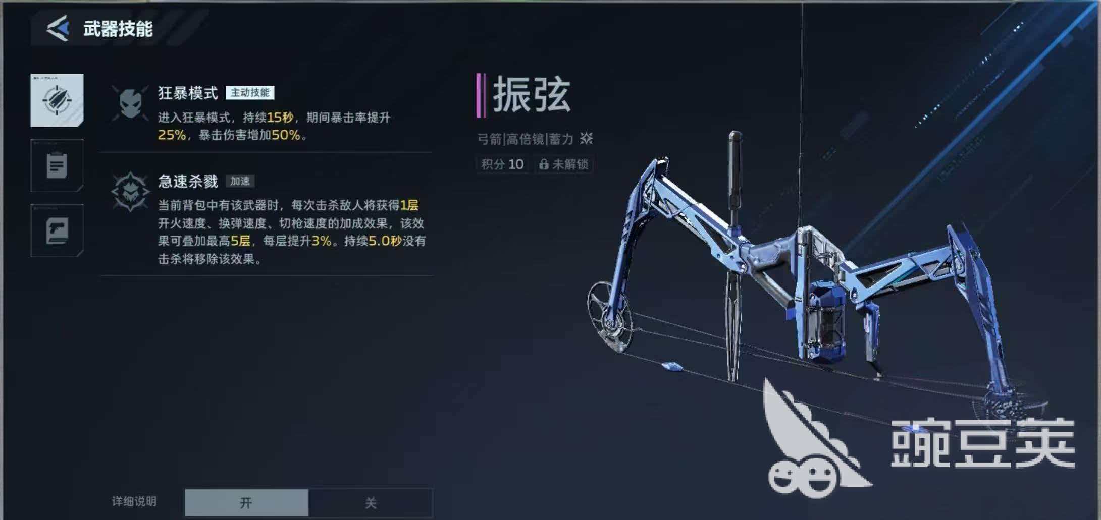 和超级复合弓相对比,振弦不管是单体伤害还是射击速度都要略逊一筹,而在技能上振弦的技能和超级复合弓的技能更是有着不同的方面,振弦的主动技能释放以后,武器会进入到狂暴的模式,该模式中武器的设计率和暴击伤害分别能够提升25%和50%,而且武器造成的伤害加成还能够叠加15%,被动效果急速杀戮则是一个不适用,只要武器在背包里面就能够触发效果的技能,只要振弦放在背包里面,那玩家每一次成功击杀敌人的时候都会获得一层开火速度、换弹速度以及切枪速度的加成。