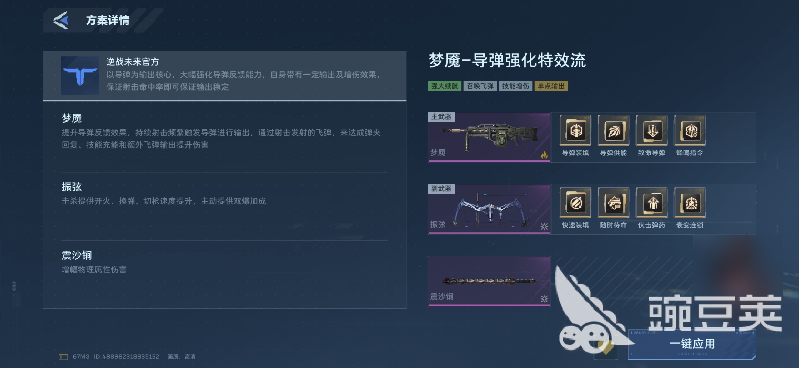 在配装思路上,梦魇推荐采用特效流路线,重点放大飞弹频率与增伤叠加效率。最优配件组合为:导弹填装、导弹供能、知名导弹、蜂鸣响应。该搭配可显著提升飞弹释放密度、充能速度及单次飞弹伤害,兼顾持续作战与关键节点爆发。前期尚未集齐理想配件时,建议优先采用系统智能推荐方案,确保基础战力不打折。