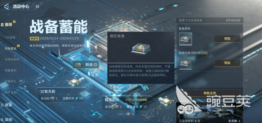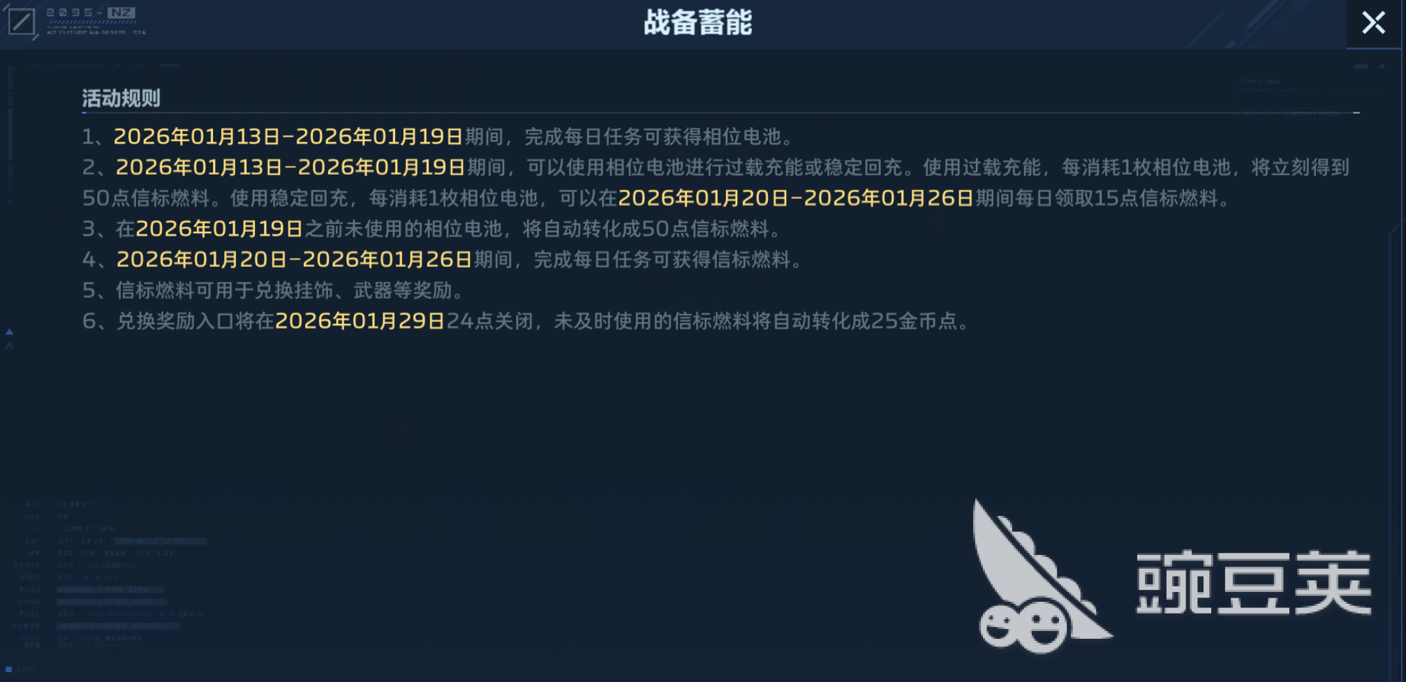 战备储能玩法操作门槛低,每日登录并完成任意一场对战即可领取2个相位电池;每消耗1个相位电池,可兑换50点信标燃料。此外,自1月20日起至1月26日,系统将额外开放【稳定回充】机制——在此期间,每日消耗1个相位电池,还可额外获得15点信标燃料,进一步提升资源获取效率。
